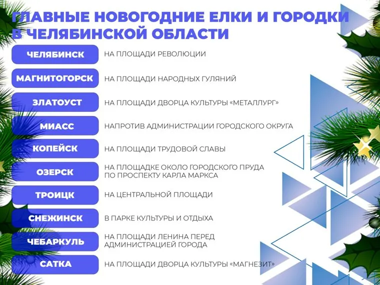 В Чебаркуле открыт праздничный городок с елкой, горкой и домиком Деда Мороза на площади Ленина, перед мэрией. Жители Сатки смогут полюбоваться главной елкой на площади Дворца культуры «Магнезит». Там же появится городок из ледяных блоков.