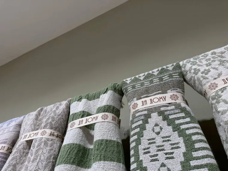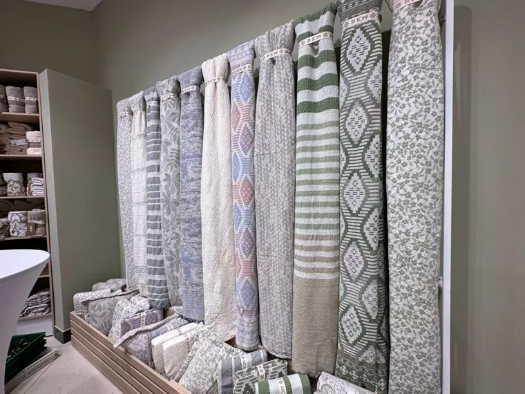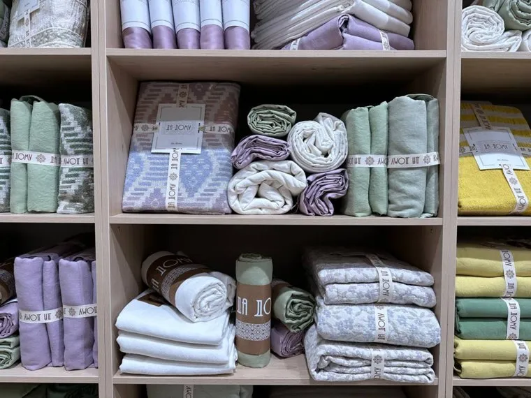 В магазине большой выбор различных одеял и полотенец из натуральных компонентов
