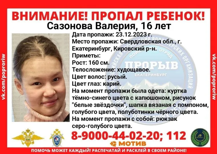 Последний раз 16-летнюю Валерию Сазонову видели в Кировском районе 23 декабря. Рост девочки составляет 160 сантиметров, русые волосы, карие глаза. Была одета в куртку темно-синего цвета с рисунком белых звезд, вязанную шапку с помпоном и черные полуботинки. УМВД России по Екатеринбургу ОП №6 организовали поиски ребенка.