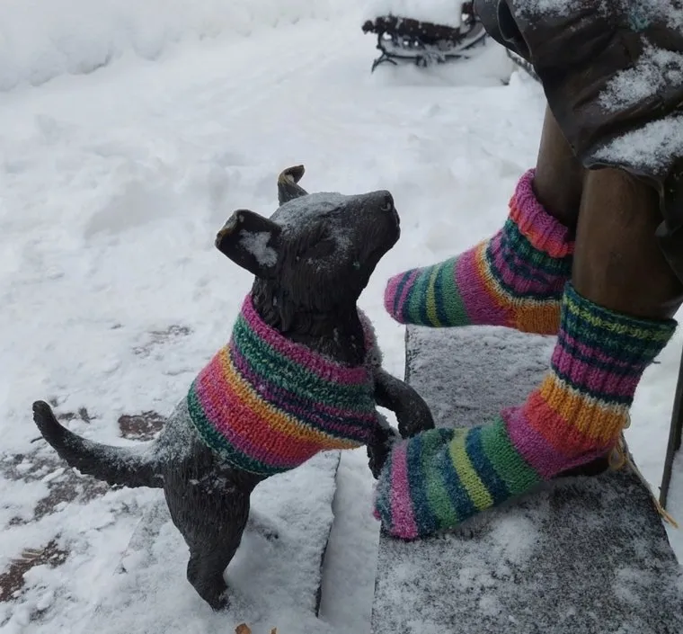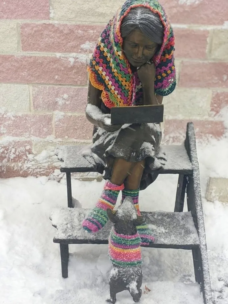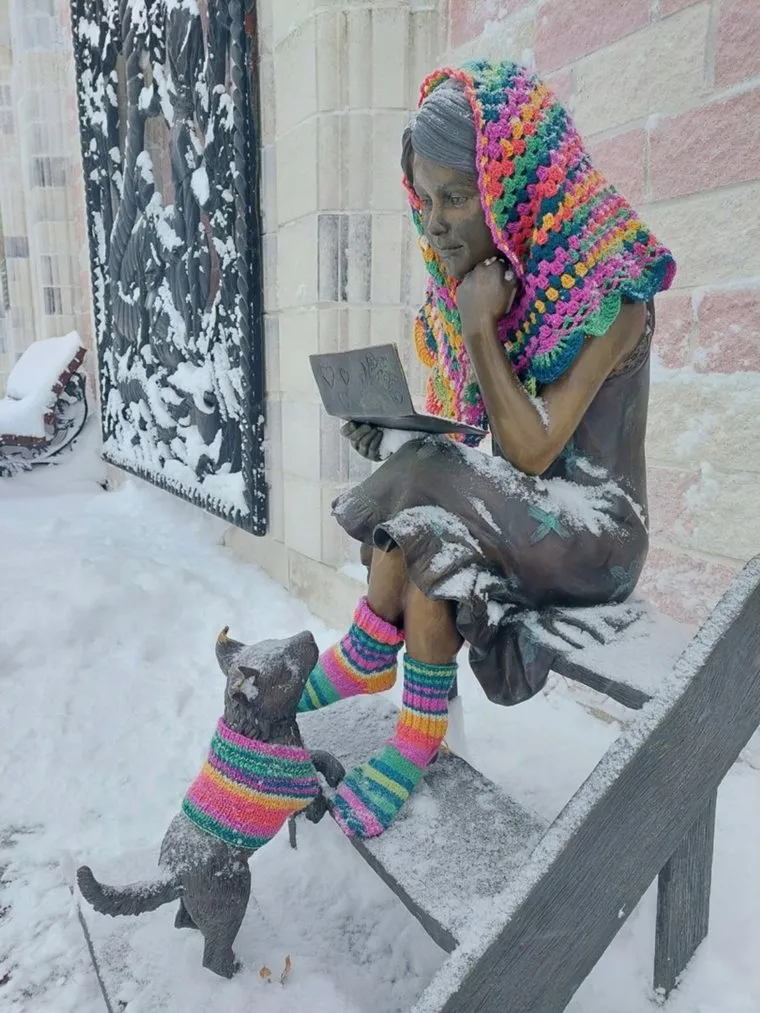 «Скульптуры читающих детей, которые в летних платьях, одели в теплую одежду. Пальто достались и животным — собачкам. Вязанием занимались восемь сотрудников. Работа продолжается», — пояснила URA.RU Бутенко.