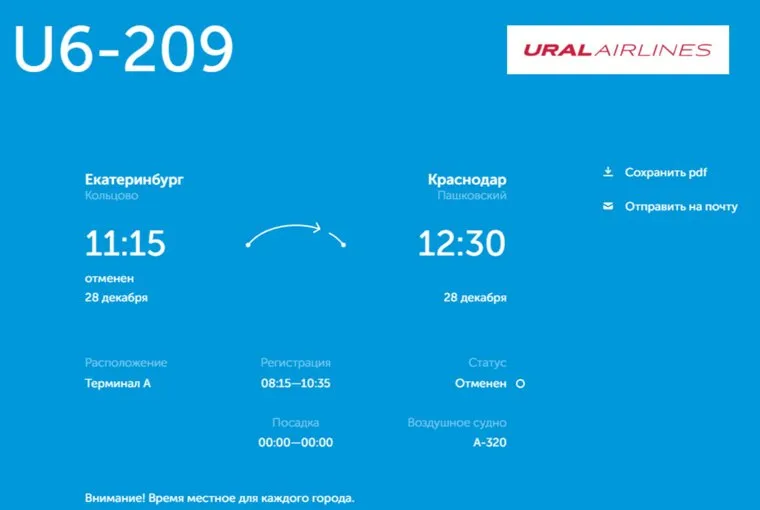«Уральские авиалинии» отменили рейс из Екатеринбурга в Краснодар. Скрин