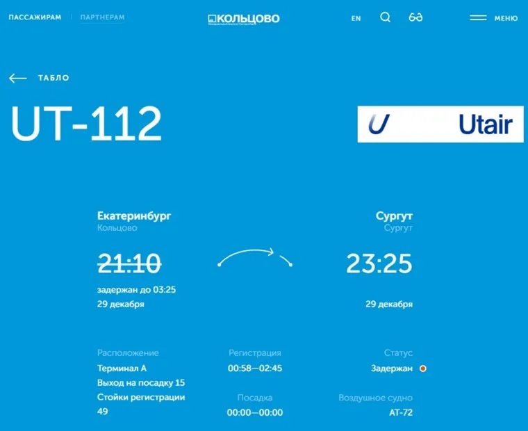«Рейс авиакомпании Utair по маршруту Екатеринбург — Сургут 28 декабря задержан. Плановое время вылета в 21:10 28 декабря. Фактическое время вылета — 29 декабря 2023 года в 3:25», — сообщается на сайте воздушной гавани Екатеринбурга.