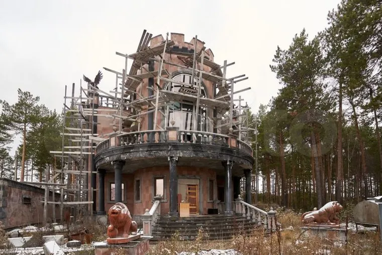 Другой элитный особняк Сургута оформлен в стиле средневекового замка. Его крыша выполнена в виде башни, на которой красуются бронзовые орлы. А вход здания украшен двумя статуями львов. Дом не достроен — его окружают строительные леса. Но уже в таком виде он стоит 65 миллионов рублей. «Дом четырехэтажный, цокольный этаж готовился под баню, сауну, хамам, бассейн, бильярд», — говорится в публикации сайта «Авито».