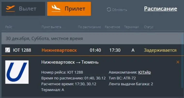 «Рейс авиакомпании Utair по маршруту Нижневартовск — Тюмень 30 декабря задержан. Плановое время прилета в 01:40 30 декабря 2023 года. Фактическое время прилета — 30 декабря 2023 года в 17:30», — сообщается на сайте тюменского аэропорта Рощино.