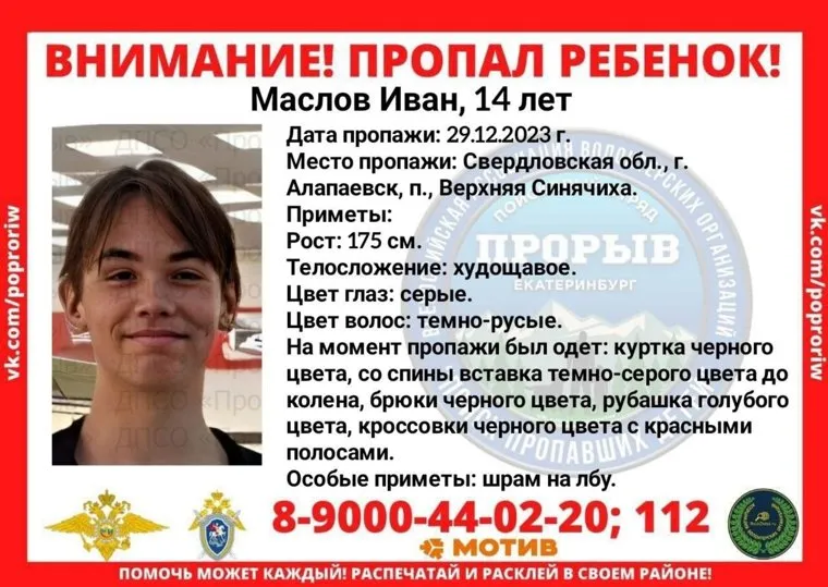 «Внимание! Пропал ребенок! Местонахождение 14-летнего Ивана Маслова неизвестно с 29 декабря. Последний раз подростка видели под Алапаевском в поселке Верхняя Синячиха. Приметы: рост 175 сантиметров, худощавое телосложение, серые глаза, темно-русые волосы и шрам на лбу. Был одет в черные куртку и брюки, голубую рубашку и черные с красными полосами кроссовки», — пишет сообщество «СРОО ДПСО „ПРОРЫВ“ Свердловская область» соцсети «ВКонтакте».