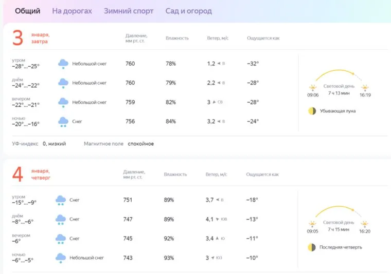 По данным «Яндекс Погода», в Кургане в этот день ожидается температура 22-28 градусов ниже нуля. Четвертого января, сервис прогнозирует температуру -8, -6 градусов днем.