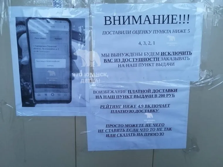 «Вот таким простым способом, оказывается, можно поднять рейтинг в любом пункте выдачи заказов. Wildberries в [Нефтеюганске]», — передает telegram-канал «Это Юганск, детка!». На фотографии видно, что кто-то приклеил объявления о том, что точка выдачи якобы хочет ограничить доступ заказывать вещи или сделать платную доставку в размере 200 рублей.
