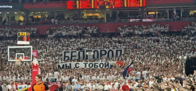 «Белогород, мы с тобой», — гласит надпись на баннере сербских болельщиков, передает РИА Новости. Баскетбольный матч проходит между командами «Црвена Звезда» и «Партизан».