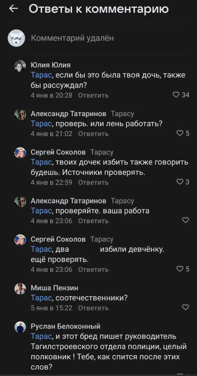 Замначальника отдела полиции № 19 Нижнего Тагила (Свердловская область) Тарас Булгаков оставил комментарий к новости про избитую братьями-азербайджанцами 11-летнюю девочку в одном из городских новостных сообществ, однако удалил его после критики от других пользователей. Именно на территории этого отдела случилось нападение.