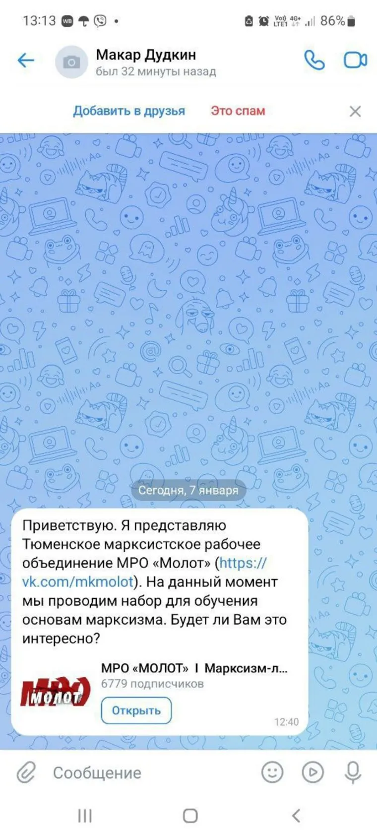 Жителям Тюменской области массово предлагают обучиться основам марксизма. Им приходят сообщения от представителей марксистского рабочего объединения «Молот». Об этом URA.RU сообщили сразу несколько читателей.