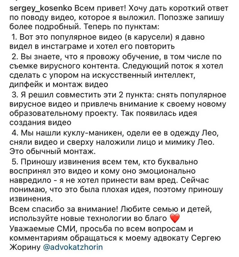 «Хочу дать короткий ответ по поводу видео, которое я выложил. <…> Мы нашли куклу-манекен, одели ее в одежду Лео, сняли видео и сверху наложили лицо и мимику Лео. Это обычный монтаж», — написал Сергей Косенко у себя в соцсетях.