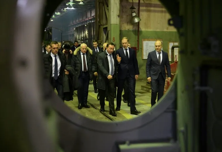 Появились кадры с обхода Мантуровым и Якушевым секретных заводов Екатеринбурга