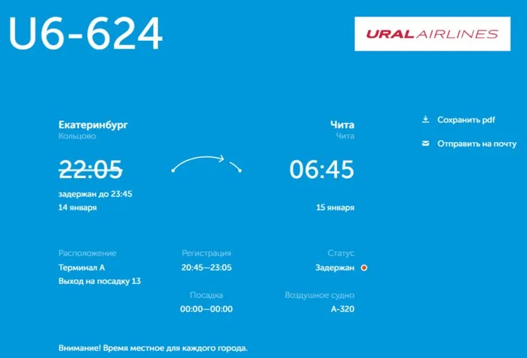 «Вылет рейса U6-624 из Екатеринбурга был запланирован 14 января в 22:05, но перенесен на 23:45. Посадка самолета A-320 в Чите назначена на 15 января в 06:45 по местному времени. Вылет рейса U6-173 намечался на тот же день в 19:05, но его перенесли на 23:45. Посадка воздушного судна A-320NEO в Хабаровске планируется в 06:25 по местному времени», — следует из онлайн-табло Кольцово. Причина задержки рейсов не уточняется.
