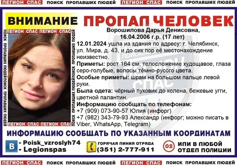 «В Челябинске пропала Ворошилова Дарья Денисовна, 16.04.2006 года рождения (17 лет). С 12 января она ушла из дома №43 по улице Мира и до сих пор ее местонахождение неизвестно», — указали в сообществе «Легион-Спас» в соцсети «ВКонтакте».