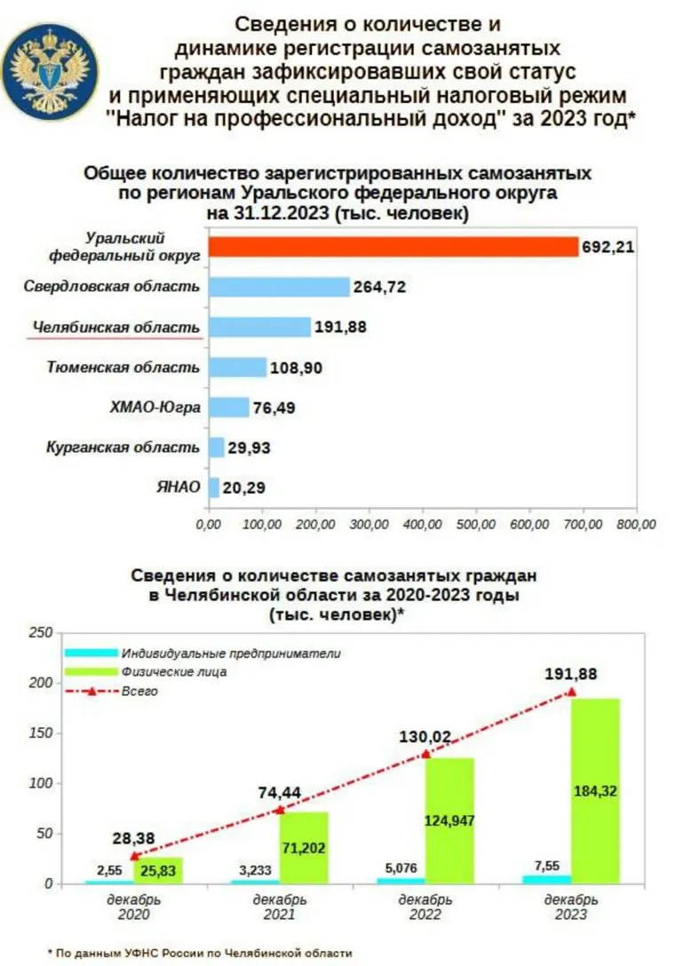 «По состоянию на 30 декабря 2023 года, общее количество самозанятых в Челябинской области составило 191,88 тысячи человек. С декабря 2022 по декабрь 2023 года число таких граждан увеличилось на 61,86 тысячи человек», — уточнили URA.RU в КСП.
