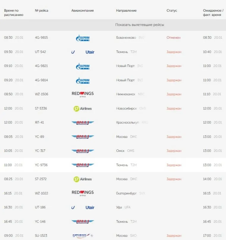 Перенос коснулся сразу трех рейсов в Москву и двух рейсов в Тюмень. Самая длительная задержка ждет пассажиров авиакомпании «Аэрофлот». Их рейс в Домодедово перенесен с 20 января 9.00 на 17.00.