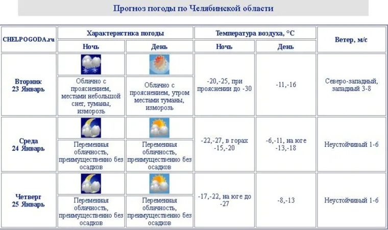 «В ночь на вторник в Челябинской области будет облачно с прояснением, местами небольшой снег, туманы, изморозь. Ночью ожидается 20-25 градусов мороза, при прояснении до 30 градусов мороза. Днем 23 января потеплеет до минус 11-16 градусов», — пояснили в областном гидрометеоцентре.