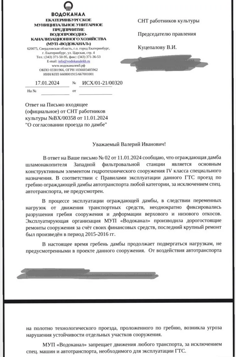 Официальный ответ «Водоканала» на запрос жителей СНТ о «Согласовании проезда по дамбе»