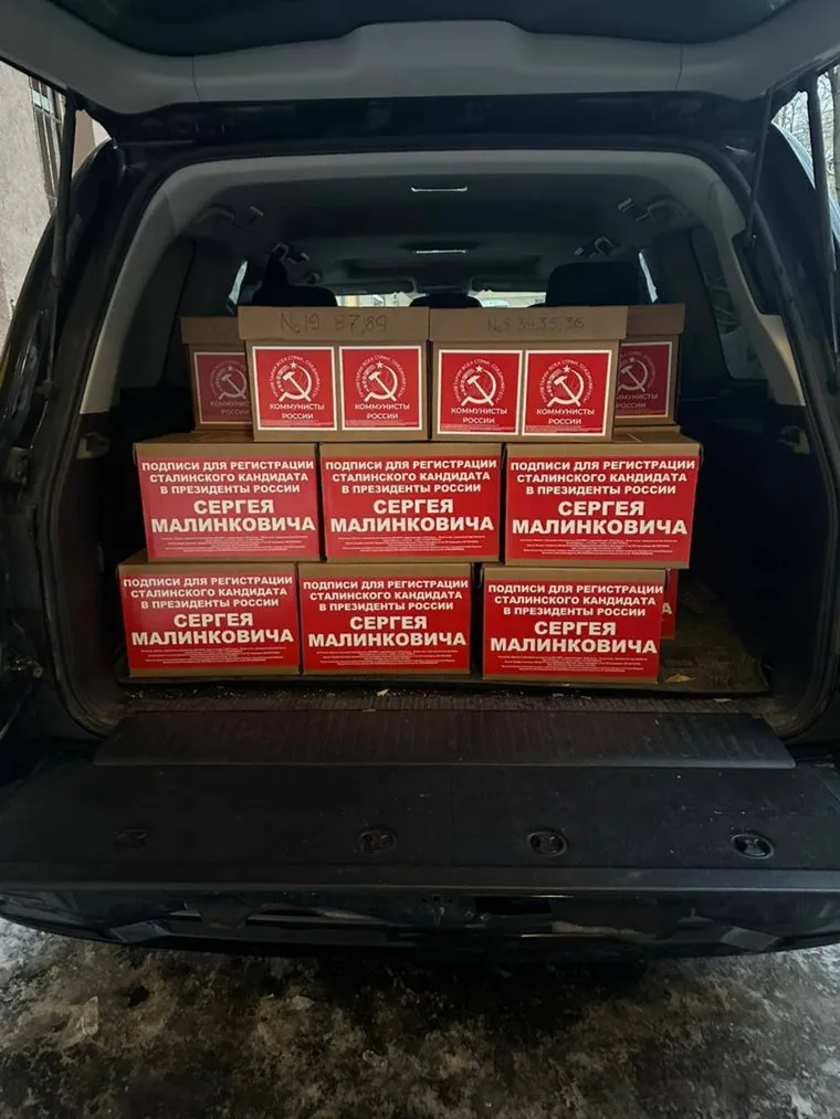Процесс загрузки коробок с подписями перед их отправкой в ЦИК представители партии показали в своем telegram-канале. «Активисты загружают в партийный автомобиль коробки с драгоценными подписями, собранными для регистрации сталинского кандидата в президенты, пролетарского депутата Сергея Малинковича», — сообщается в telegram-канале.