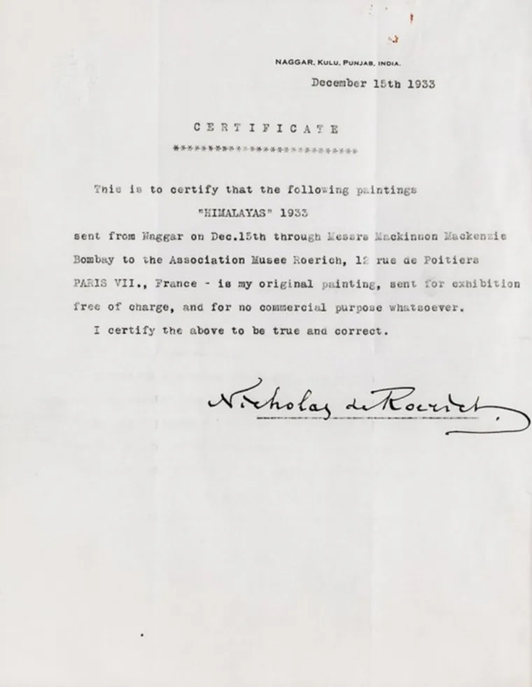 «Историко-культурным значением обладает выставленное на аукцион машинописное письмо-сертификат Николая Рериха с его собственноручной подписью (Индия, Наггар, 1933 г.). В нем художник подтверждает оригинальность своей картины „Гималаи“, отправленной для выставки», — объяснили представители «Литфонда». Стартовая цена письма — 70 000 рублей. Кроме того, можно будет купить за 180 тысяч рублей и другой автограф художника — на литографии с картины его младшего сына Святослава Рериха.