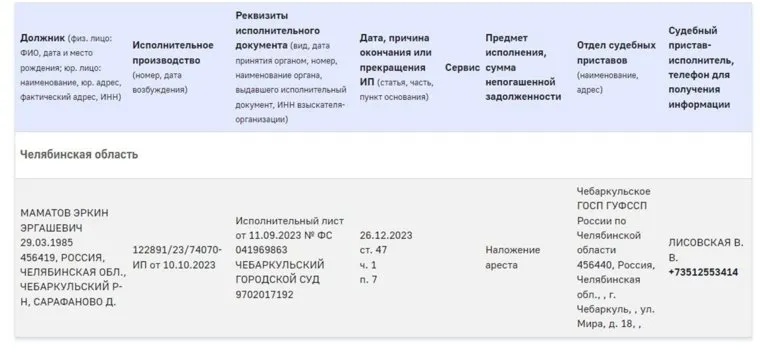 На сегодня долги взыскивают с Маматова ООО «ЭОС», ООО «Сентинел», ООО «Феникс», а также коллекторские агентства «АРС ФИНАНС» и «Титан». Общая сумма задолженности составляет 1 млн 266 тысяч рублей.