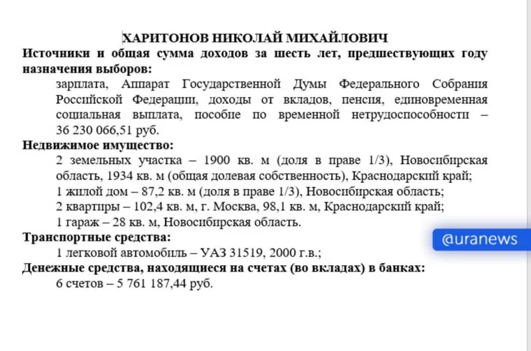 Доход Харитонова за шесть лет составил 36,2 миллиона рублей. У него — два участка, дом, две квартиры в Москве и Краснодарском крае, гараж и УАЗ. На счетах находится 5,7 миллиона рублей.