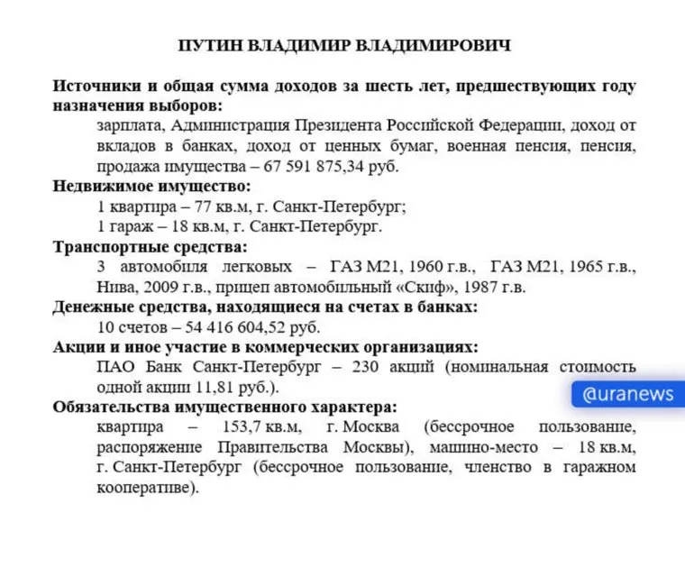 В собственности нынешнего президента — одна квартира и гараж в Санкт-Петербурге, три автомобиля — ГАЗ М21, ГАЗ М21, «Нива», а также автоприцеп «Скиф». У Путина есть 230 акций номинальной стоимостью 11,81 рубля в банке Санкт-Петербург.