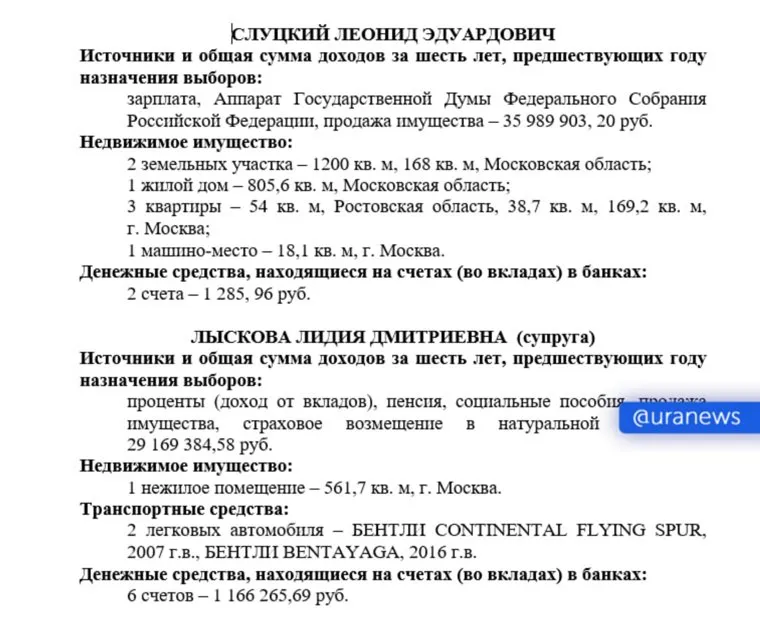 Слуцкий за шесть лет заработал почти 36 миллионов рублей. В его собственности находятся два участка, один жилой дом, три квартиры (одна в Ростовской области, две в Москве), одно машиноместо. В банках у него всего два счета, на которых, по данным ЦИК, 1 285 рублей. У его супруги на счетах лежит 1 166 265 рублей.
