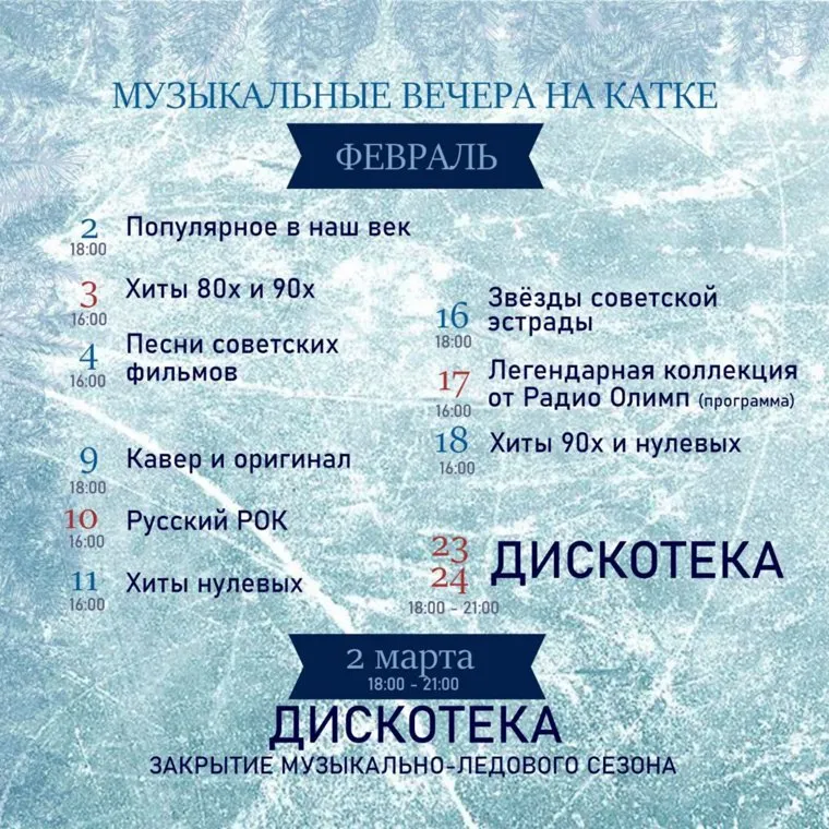 Дискотеки на льду в парке Гагарина пройдут как под хиты восьмидесятых-девяностых, так и нулевых. Диджеи будут ставить топовые песни и радовать гостей популярными каверами. 4 февраля будет вечер под музыку из советских кинофильмов. 10 февраля пройдет вечеринка русского рока. Более подробную информацию можно увидеть на афише ниже.
