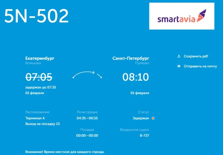 «Вылет воздушного судна B-737 из Екатеринбурга был назначен 1 февраля в 07:05, а посадка в Санкт-Петербурге в 08:10 по местному времени. Рейс 5N-502 задержан до 07:35», — следует из онлайн-табло Кольцово. Однако с самого начала рейс был задержан в Екатеринбурге до 08:00.