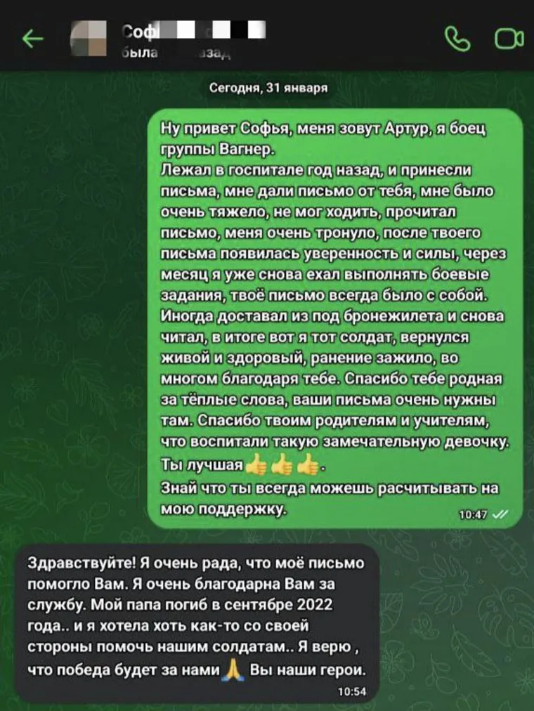 Пермский боец частной военной компании «Вагнер» по имени Артур разыскал девочку, письмо которой он получил, когда находился на спецоперации. Скрин переписки бойца и девочки разместил telegram-канале «Прикамские витязи», который ведут ветераны СВО. По словам Артура, год назад он оказался в госпитале после ранения. Автором письма оказалась девочка по имени Софья. Боец признался что письмо его «очень тронуло» и вселило «уверенность и силы». После поправки он брал его с собой на боевые задания.