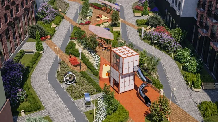 Застройщик осваивает пространство в рамках программы комплексного развития территории. Вдоль нового бульвара появятся мосты — они будут мягко перетекать друг из друга, как горячий тягучий металл. Многие МАФы, например, игровой комплекс для детей, будут напоминать инженерные сооружения.