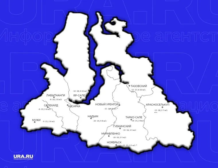 В восточной части региона снег будет идти в Тазовском и Красноселькупском районах, небольшие осадки пройдут в Новом Уренгое. В южной части округа в Ноябрьске, Губкинском и Муравленко столбик термометра будет незначительно колебаться, от -20 градусов ночью, до 15-17 днем.