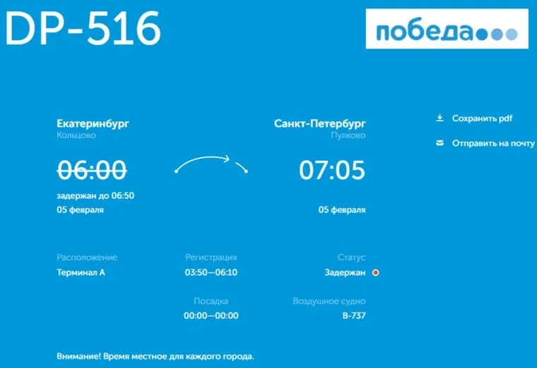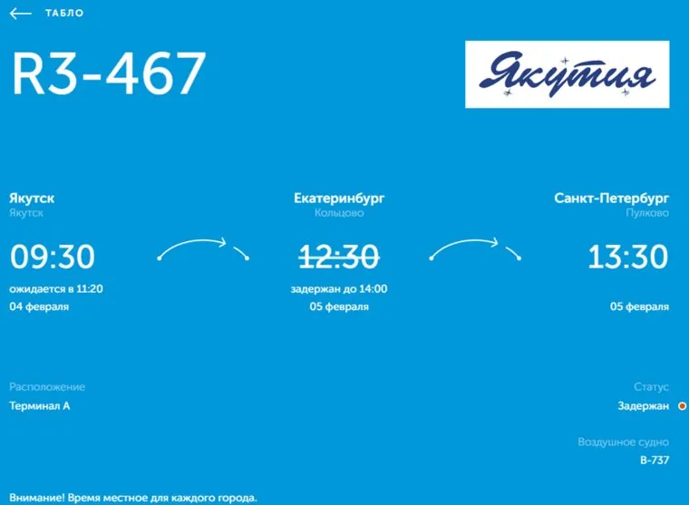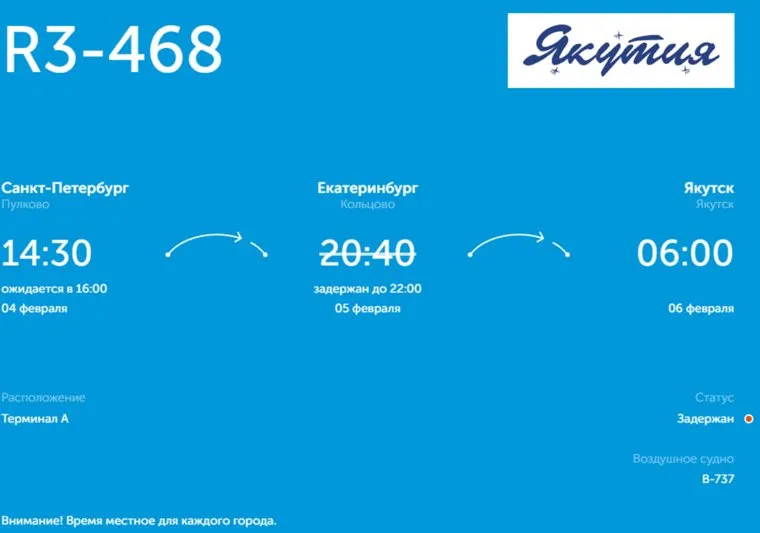 «Вылет воздушного судна B-737 авиакомпании „Победа“ из Екатеринбурга в Санкт-Петербург (рейс DP-516) перенесен 5 февраля с 06:00 до 06:50 часов. Еще один самолет B-737 авиакомпании „Якутия“ в Санкт-Петербург (рейс R3-467) задержан с 12:30 до 14:00 часов. Рейс R3-468 того же перевозчик в Якутск (самолет B-737) задержан в Екатеринбурге с 20:40 до 22:00 часов», — следует из онлайн-табло Кольцово.