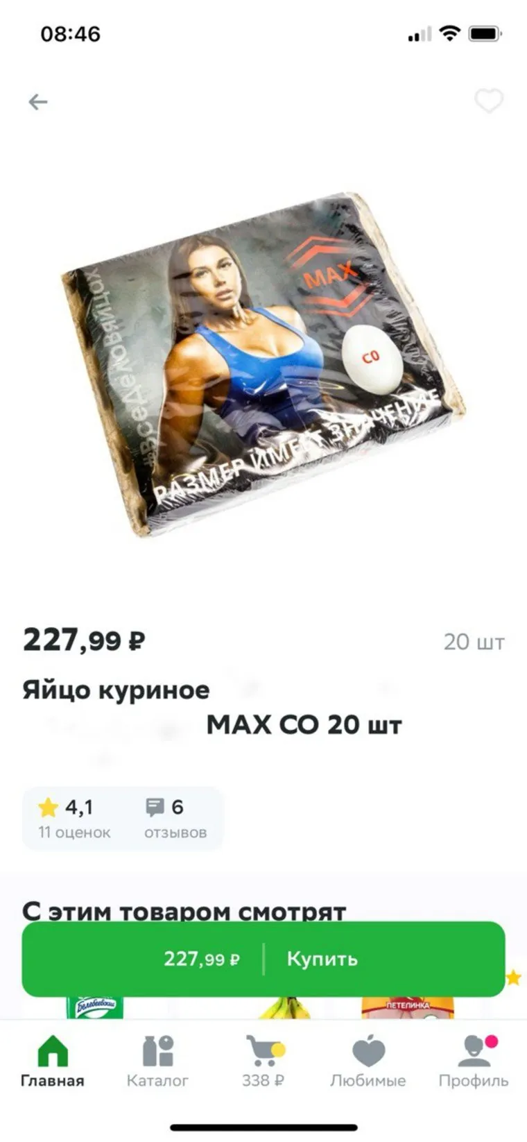 «Яйцо куриное, МАХ, СО, 20 штук. Стоимость: 227 рублей, 99 копеек», — указано в приложении по доставке продуктов.