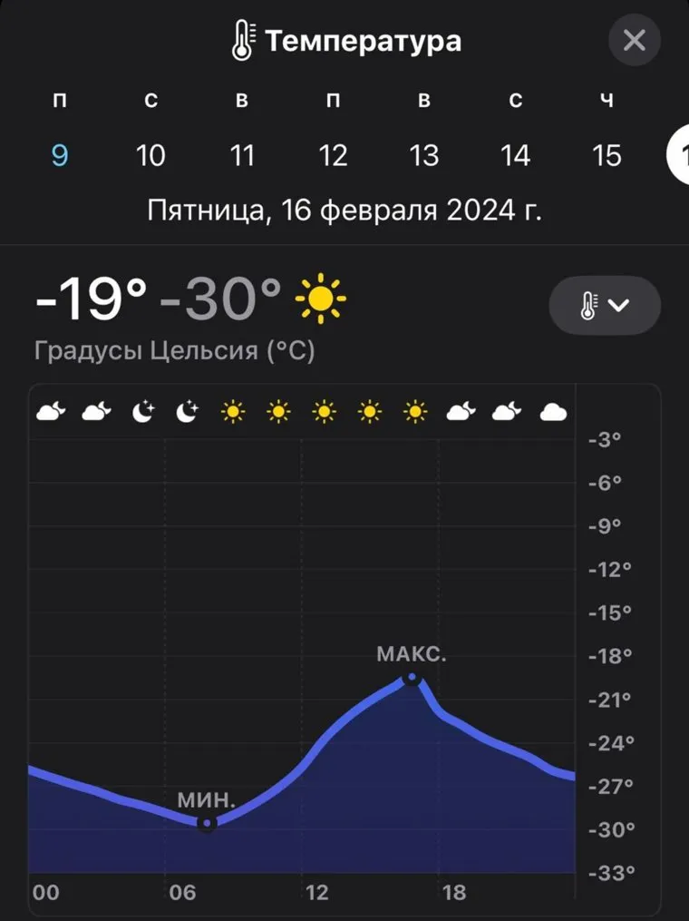 Так, пик придется на четверг и пятницу 15—16 февраля. Дневная температура составит примерно минус 18-19 градусов, а ночью столбик термометра опустится до 28-30 градусов мороза.