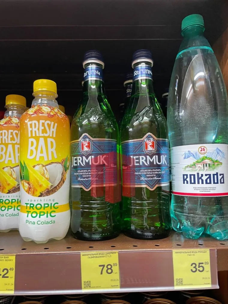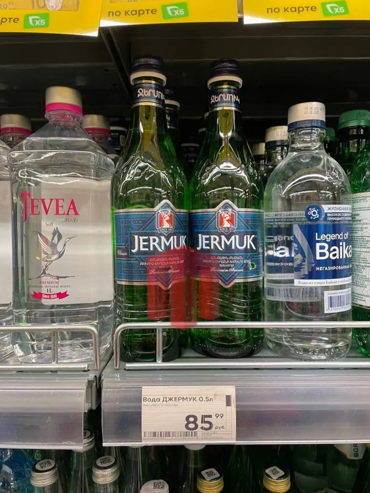 «Мы нашли опасную минералку „Джермук“ на прилавках пермских магазинов. На фото — „Перекресток“ и „Красное&Белое“», — говорится в telegram-канале «Большая Пермь».