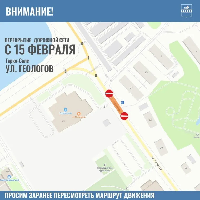 «С 15 февраля в Тарко-Сале на две недели будет перекрыт участок дороги по улице Геологов. На месте установят временные знаки», — сообщает пресс-служба мэрии Пуровского района в официальном telegram-канале.