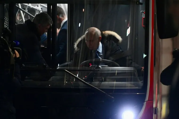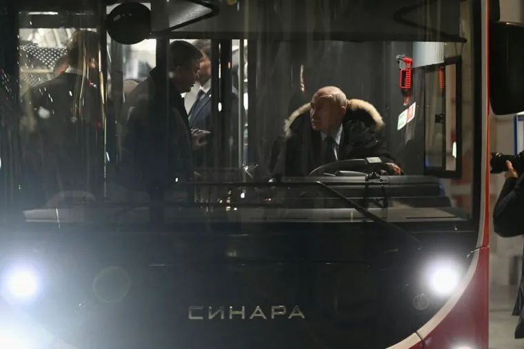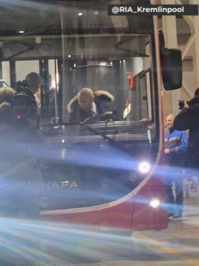 23:11 15.02.2024 Журналисты кремлевского пула публикуют несколько кадров Путина за рулем нового свердловского электробуса в Telegram.