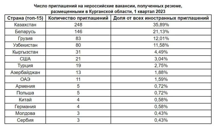 Сообщается, что в курганских работниках наиболее всего были заинтересованы компании из Казахстана (оттуда пришло 36% приглашений от общего числа, то есть 248 предложений), Беларуси (146 предложений), Грузии (83 приглашения) и США (21 приглашение). Также интерес к курганцам проявили фирмы из Узбекистана, Кыргызстана, Турции, Азербайджана, ОАЭ, Армении, Польши, Китая, Германии, Молдовы и Сербии. Журналисту URA.RU пояснили, что за 2023 год число приглашений для россиян в целом выросло на 38%.