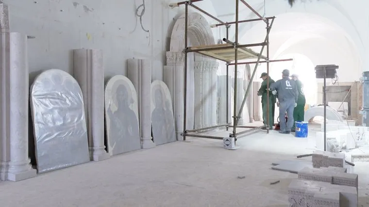 Иконы на время отделочных работ будут находиться в защитных пленках. Установят их на иконостасе в нижнем храме. Открыть храм для молитв планируют к Пасхе.