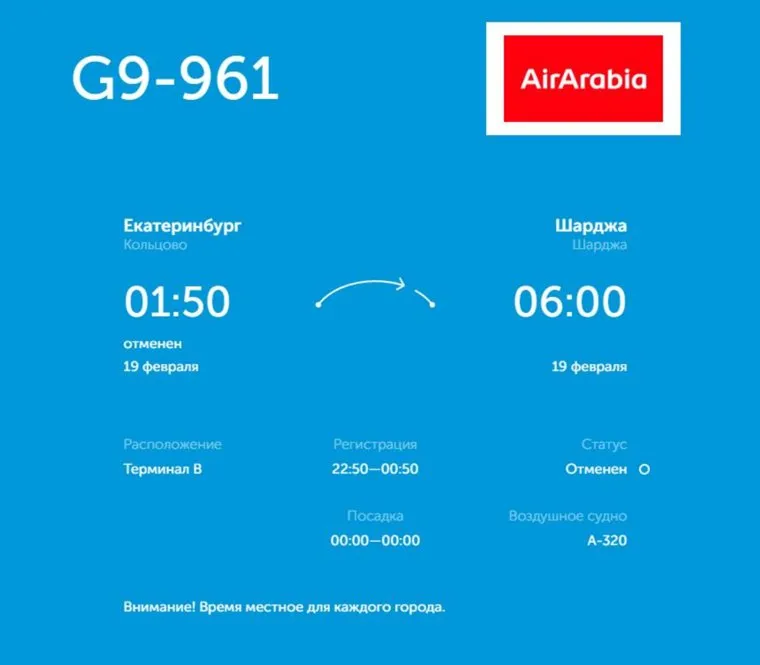 «Вылет самолета A-320 из Екатеринбурга был назначен на 19 февраля в 01:50. Посадка в одноименном аэропорту Шарджа ожидалась в 06:00 по местному времени. Вылет авиарейса G7-961 отменен», — следует из онлайн-табло Кольцово.