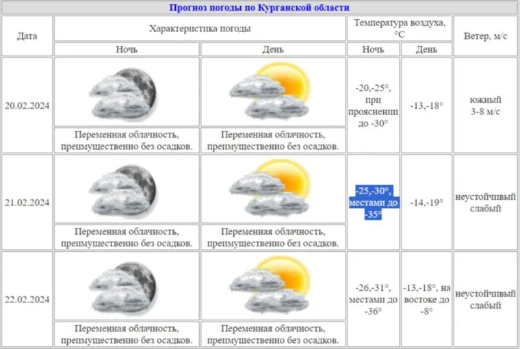 Отмечается, что пик морозов придется на 21—22 февраля. Температура воздуха составит -25,-30, местами до -36 градусов при неустойчивом, слабом ветре. Днем 21 февраля воздух прогреется до -14, -19 градусов, а на следующий день 22 февраля — до -13, -18 градусов.