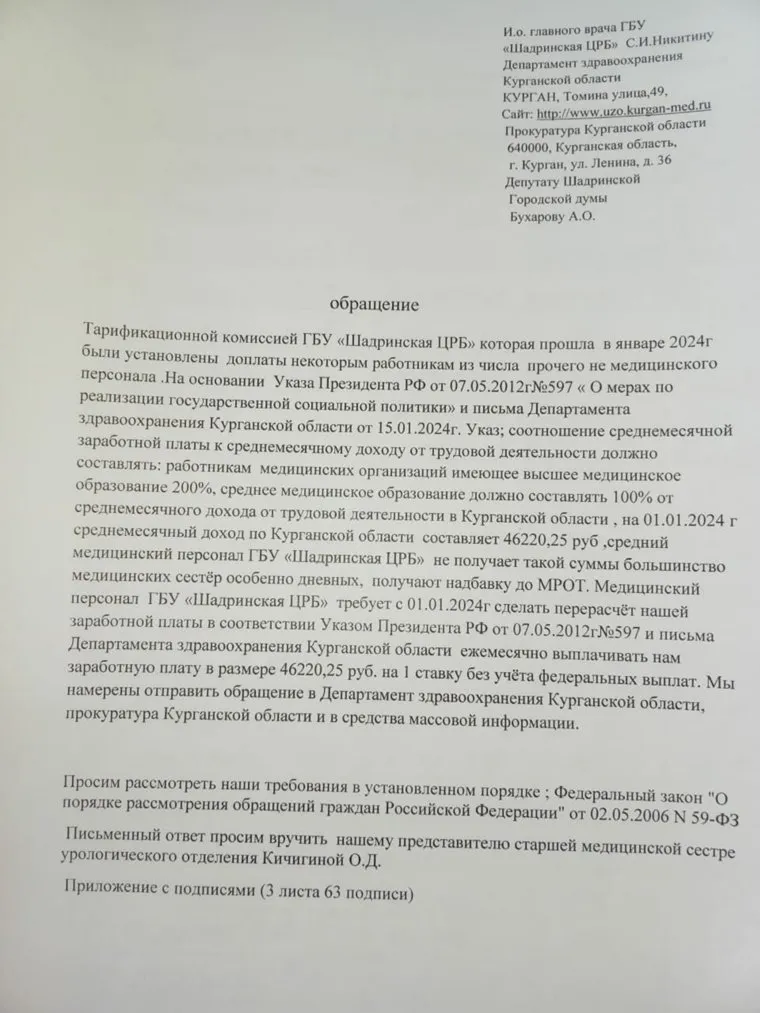 «На 1 января 2024 года среднемесячный доход по Курганской области составляет 46 220 рублей, большинство медсестер Шадринской ЦРБ не получается такой суммы, особенно те, что работают на дневной смене. Они получают надбавку до МРОТ. Медицинский персонал требует сделать перерасчет заработной платы», — указано в обращении медиков, которое они направили в депздрав и прокуратуру. Документ имеется в распоряжении редакции URA.RU.