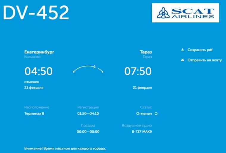 «Вылет воздушного судна A-320 авиакомпании Air Arabia рейсом G9-882 Екатеринбург — Шарджа 21 февраля в 06:05 — отменен. Также вылет самолета B-737 MAX9 перевозчика Scat Airlines рейсом DV-452 Екатеринбург — Тараз 21 февраля в 04:50 — отменен», — следует из онлайн-табло Кольцово. Причина отмены рейсов не уточняется.