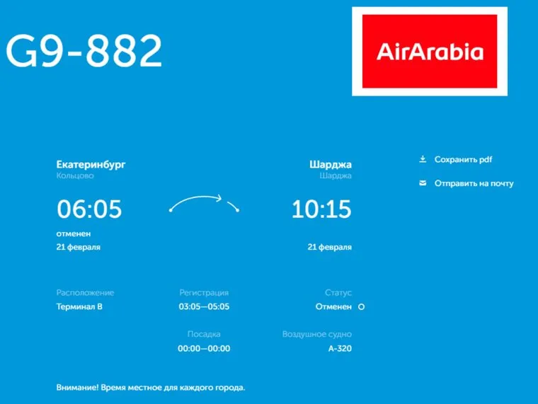 Еще 18 февраля екатеринбуржцы не смогли улететь в Шарджу на рейсе той же авиакомпании. Причина отмены рейса A-320 из уральской столицы также неизвестна.