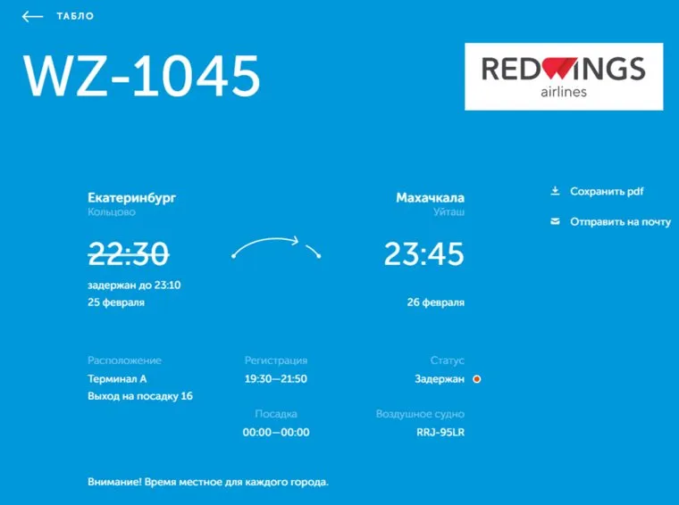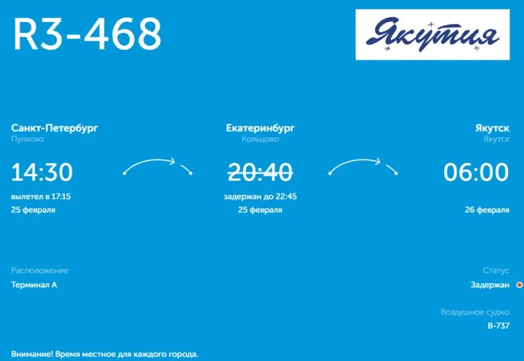 «Вылет рейса R3-468 авиакомпании „Якутия“ в Якутск задержан в Екатеринбурге 25 февраля с 20:40 до 22:45 (самолет B-737). Рейс WZ-1045 перевозчика Red Wings задержан с 22:30 до 23:10 (самолет RRJ-95LR)», — следует из онлайн-табло Кольцово. Причина переносов рейсов не уточняется.