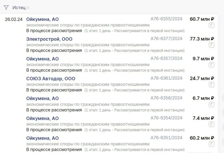 «Истец — комитет дорожного хозяйства администрации Челябинска. Ответчик АО „Ойкумена“. Сумма иска 60,668 млн рублей», — отмечено на сайте суда по одному из исков.