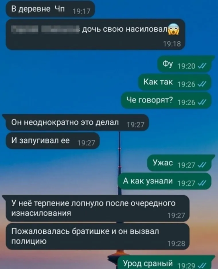 Вечером 29 февраля в группе «Признавашки Каменск-Уральский» опубликовали переписку неизвестных людей, которые обсуждали поступок Евгения. «Он неоднократно запугивал ее», — написал пользователь, имея в виду 13-летнюю девочку.