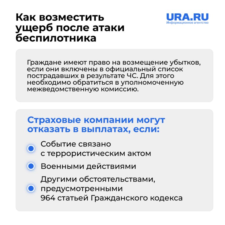 Несколько заводов эвакуировали в Екатеринбурге. На предприятиях ввели упреждающий режим реагирования на угрозу атаки БПЛА. При этом все госучреждения работают в штатном режиме. Как защитить себя при внезапной атаке БЛПА, а после возместить ущерб — в материале URA.RU. Как защитить себя при внезапной атаке Если гражданин оказался на улице в момент атаки БПЛА, первоочередной задачей для него является поиск укрытия. В таких случаях стоит немедленно переместиться в ближайшее здание или использовать природные объекты, такие как деревья, в качестве временного защитного барьера. После обеспечения собственной безопасности следует оповестить о происшествии службу спасения, набрав номер 112, или сообщить в полицию, указав точное местоположение угрозы. Как защититься от атаки БПЛА, будучи в транспорте Если человек находится в автомобиле или в общественном транспорте, когда происходит нападение дрона, рекомендуется попросить водителя немедленно остановиться, чтобы пассажиры могли покинуть транспортное средство и найти укрытие. Если же обстоятельства не позволяют выйти, следует отодвинуться от окон и максимально пригнуться, защищая голову руками, чтобы минимизировать риск травм от возможного воздействия. Как возместить ущерб после атаки беспилотника Вопрос компенсации ущерба, вызванного атакой беспилотников, зависит от квалификации инцидента как чрезвычайной ситуации. По словам юристов, граждане имеют право на возмещение убытков, если они включены в официальный список пострадавших в результате ЧС. Для этого необходимо обратиться в уполномоченную межведомственную комиссию. Однако стоит учитывать, что страховые компании могут отказать в выплатах, если событие связано с террористическим актом, военными действиями или другими обстоятельствами, предусмотренными 964 статьей Гражданского кодекса. Такие исключения должны быть четко прописаны в страховом полисе.